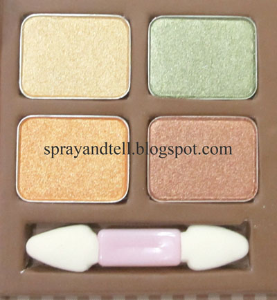 Kiwi gold is lovely warm combination of shimmering colors: golden ivory, young grass shoot green, light golden mandarin and lovely bronzey brown. Very versatile… be it for the neutral lovers or those preferring colorful make up. Pigmentation is average for golden ivory and bronze brown, the green and mandarin swatched more pigmented. The texture is lovely, soft and easy to blend.